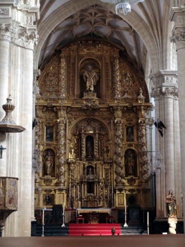 El retablo fue concebido en 1674 por Manuel del Álamo. Es de madera dorada, de tres calles. En el centro hay una virgen y en las calles laterales, a media altura, a izquierda y derecha respectivamente, están las estatuas de dos mártires. Vistos desde la primera fila de bancos/reclinatorios parecen unas figuras un poco más pequeñas que un ser humano de verdad. Lo parecen, pero nos equivocamos. La guía nos dijo que si las bajásemos y las pusiéramos a nuestro lado serían de nuestro tamaño. Son imágenes a tamaño natural.