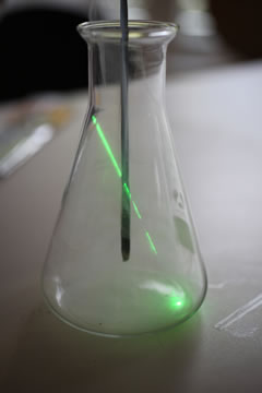 Nosotros lo hemos hecho con un matraz y con un láser de color verde; pero funciona aproximadamente igual con cualquier botella de vidrio transparente y un puntero láser de color rojo.