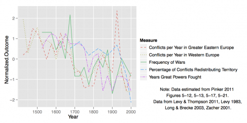 Vivimos en una era de paz históricamente sin precedentes. Tanto si nos fijamos en una escala temporal de décadas o siglos, las guerras se han hecho menos frecuentes. La figura 1 (datos extraídos del excelente nuevo libro de Pinker y fuentes originales incluidas aqui y aqui) ilustra la tendencia descendente según cinco medidas. Hay menos guerras entre grandes potencias, menos guerras en la Europa occidental, menos años de duración en las guerras de grandes potencias, y menor redistribución de territorios después de las guerras. Otras tendencias, no tan fácilmente cuantificables, son evidentes. Los países ya no codician el territorio de los demás, ni temen la invasión o coacción militar, como lo han hecho a lo largo de la mayor parte de la historia. Las identidades y aspiraciones nacionales están basadas menos en la gloria marcial, el honor, y el dominio. La ausencia relativa de guerra, y especialmente de una guerra de Gran Pontencia, desde el fin de la segunda guerra mundial, ha sido denominadaLarga Paz. Por más increíble que esto parezca a los lectores de historia, estas y otras tendencias sugieren a muchos académicos que es posible que persista la Larga Paz.