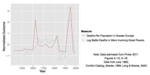 Pero a diferencia del fuerte declive en la violencia gubernamental interpersonal y doméstica (de nuevo, ver Pinker), no resulta tan obvio que los costos de la guerra hayan descendido con el tiempo. La figura 2 ilustra otras dos importantes medidas que no muestran un declive: excepto para las décadas más recientes, las muertes en batallas producidas en guerras de Grandes Potencias y las muertes en batallas en proporción a la población en Europa no muestran un descenso obvio. Pese a que las recientes décadas sí parecen ser particularmente pacíficas dadas estas tendencias a largo plazo, apenas podemos ser complacientes sobre esta tendencia. Muchos periodos de paz en las décadas anteriores terminaron en guerras devastadoras.